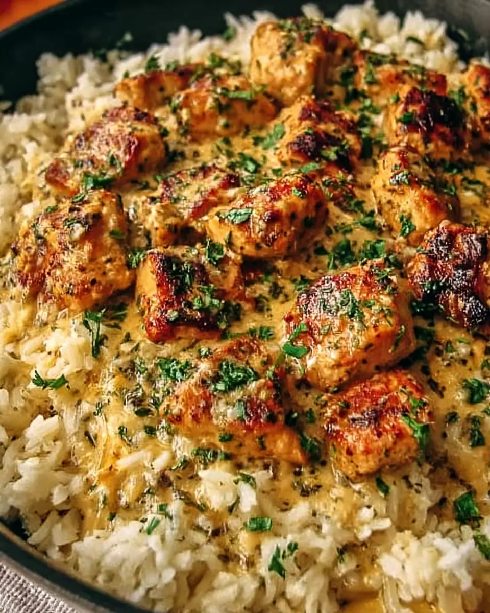 PrintCreamy Garlic Butter Chicken: Indulgent Cheesy Rice Skillet Delight