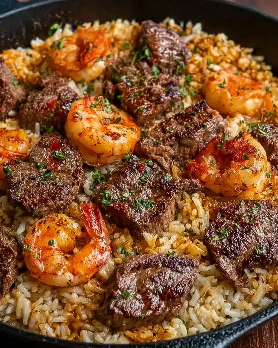 A delicious and hearty one-skillet meal combining flavors of garlic butter, surf, and turf over a bed of rice.