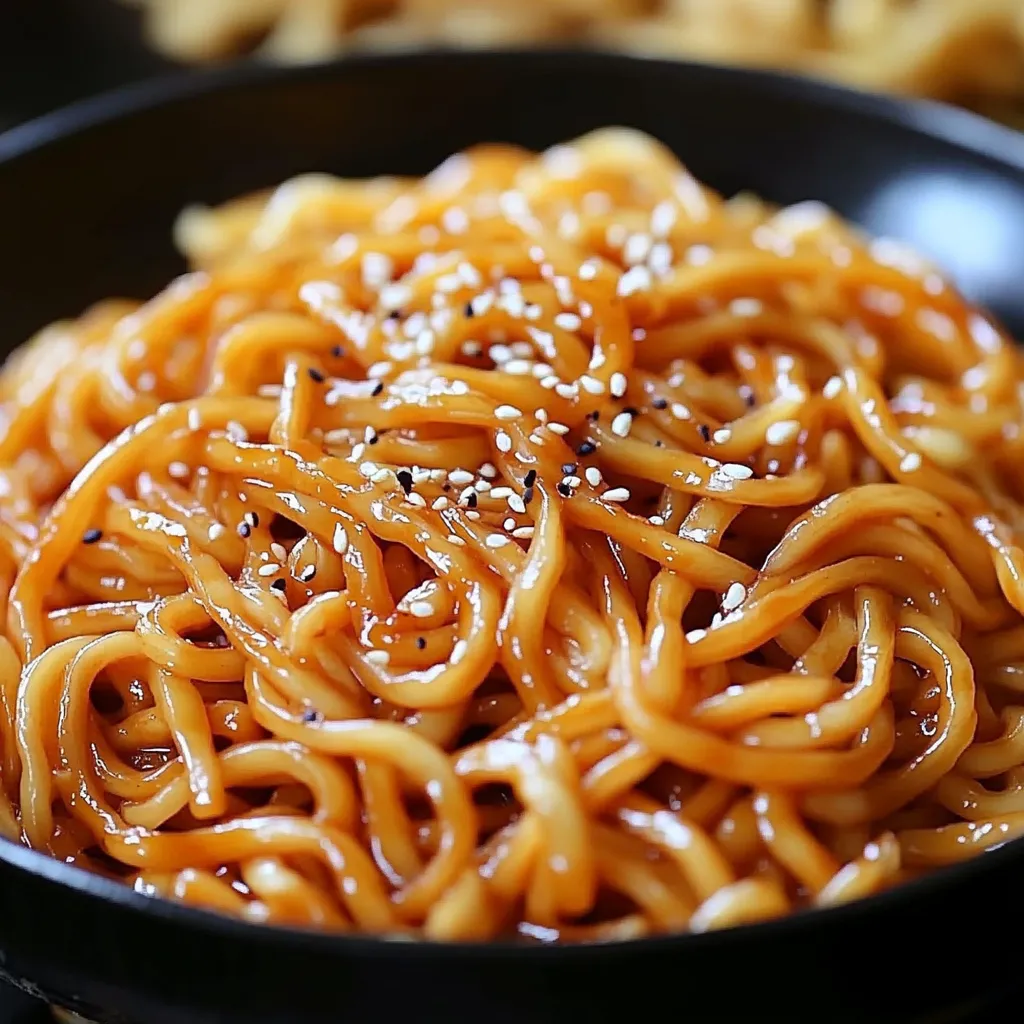 Keep stirring to prevent sticking. Season with a pinch of salt and pepper to taste. Allow the noodles to absorb the sauce fully as they heat through. - Finish with sesame oil and garnish