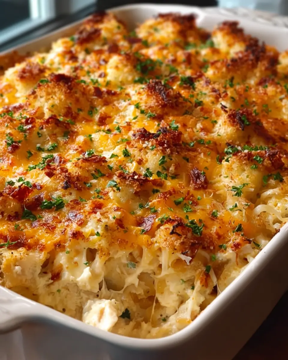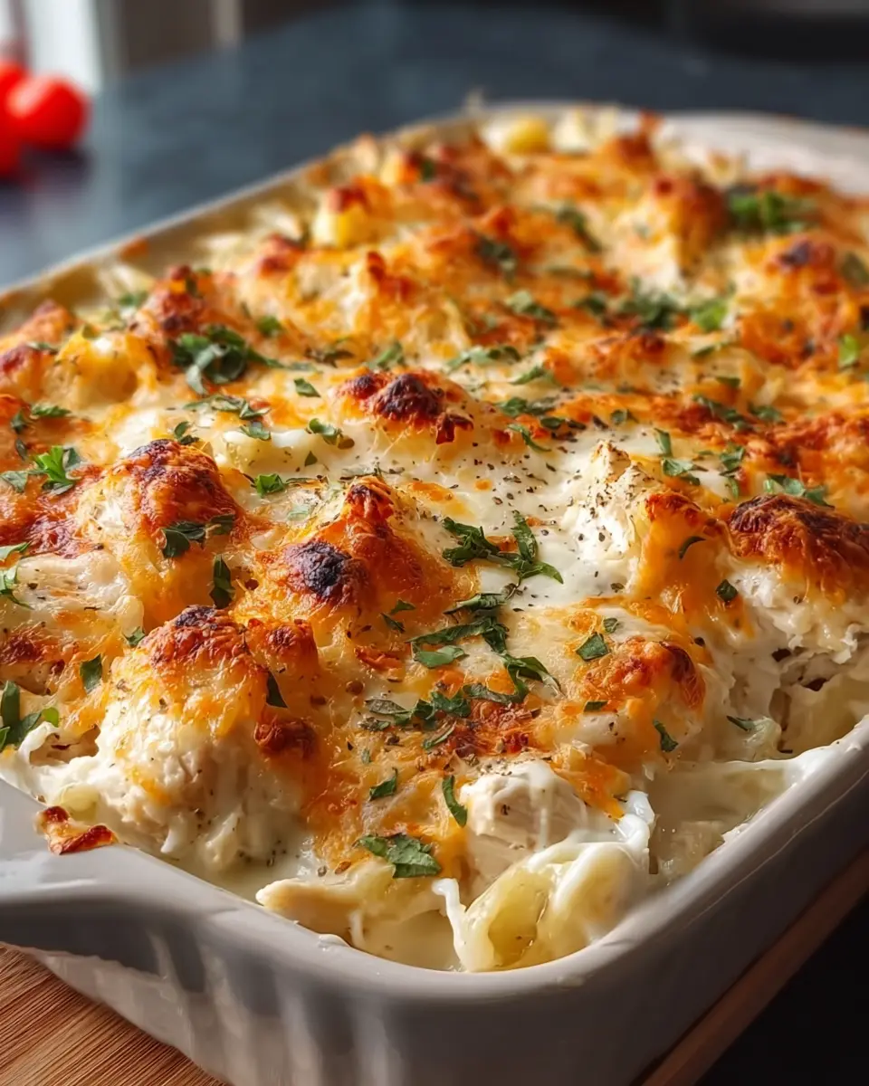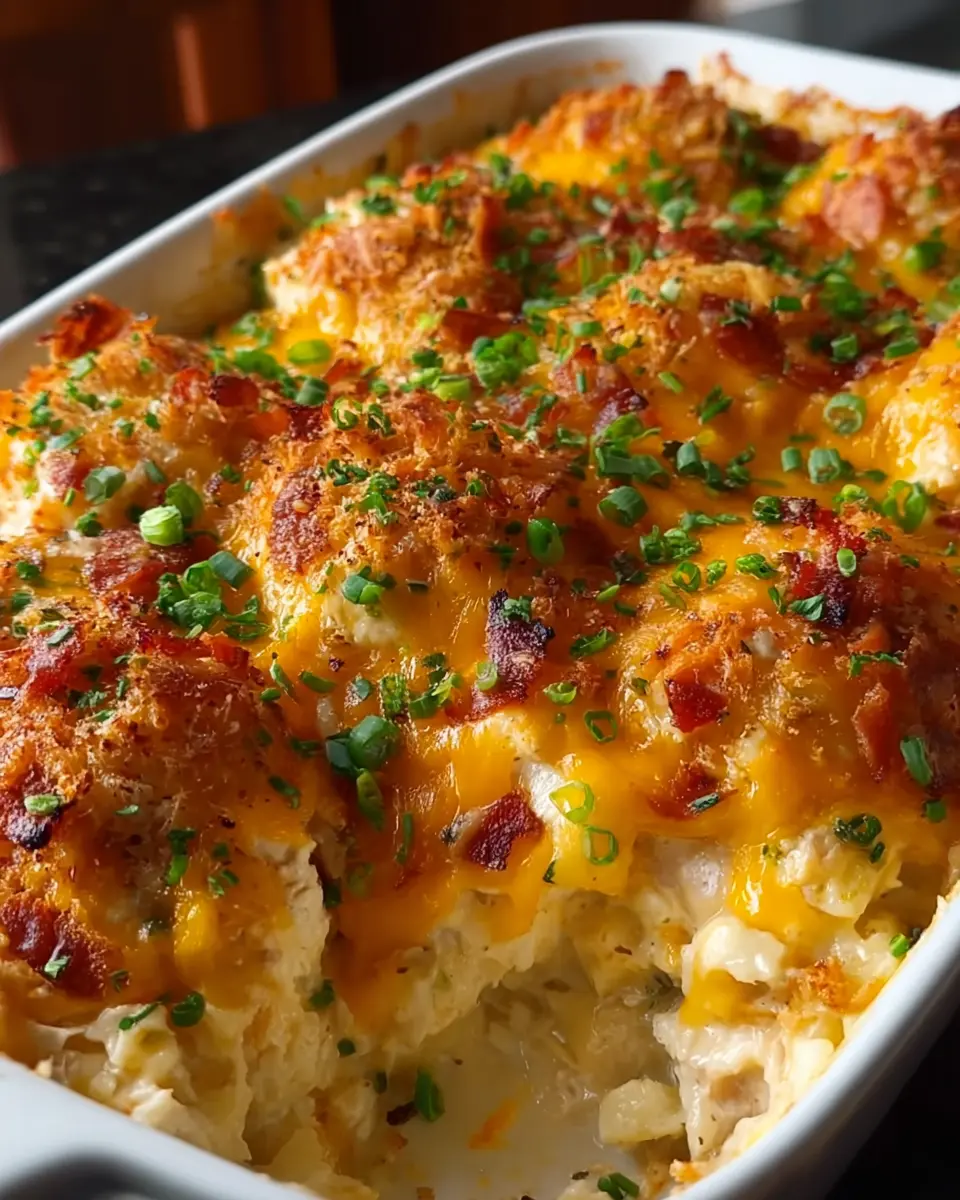 A creamy and delicious casserole featuring chicken and turkey bacon that is perfect for a comforting meal.