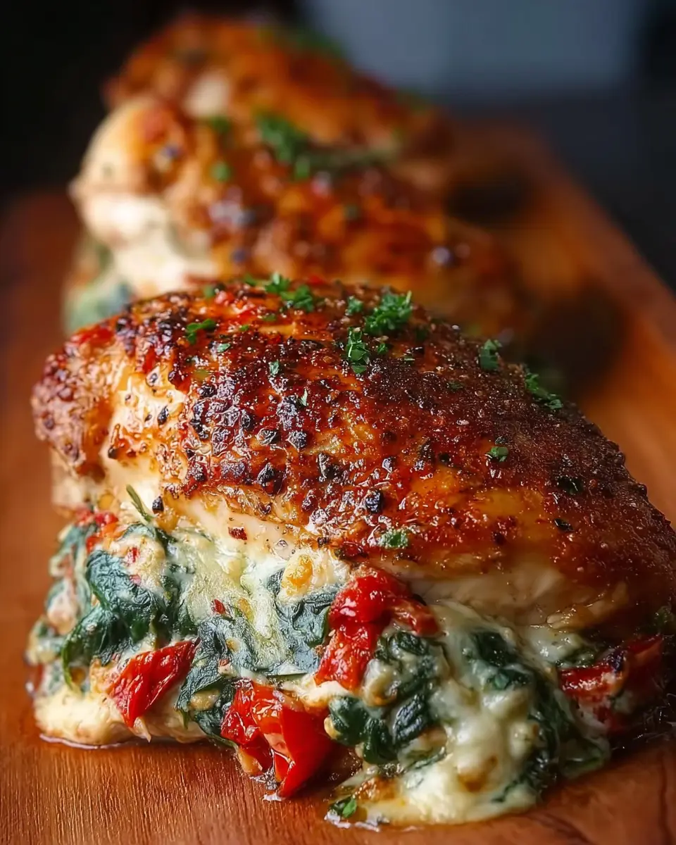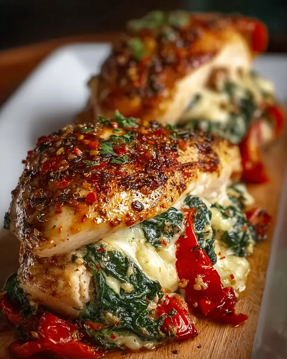 Juicy chicken breasts stuffed with roasted red peppers, fresh spinach, and creamy mozzarella for a delicious meal.