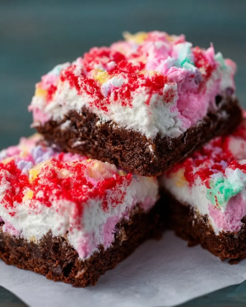 Now that the marshmallow is in place, it’s time to cool off! Allow your brownie creation to chill in the fridge for about 30 minutes. This will help everything set up nicely and make the next step easier. While waiting, beat 1 cup of heavy cream until stiff peaks form. Spread this delicious whipped topping over the marshmallow layer, creating a fluffy surface hinting at the delectable flavor within.